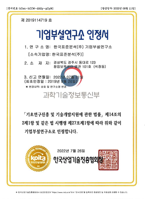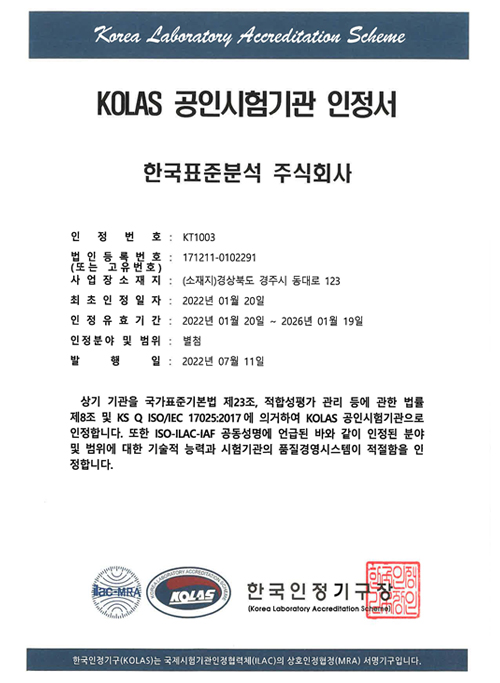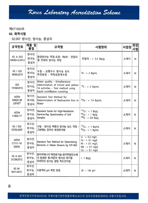 2022년 1월 KOLAS 한국인정기구로부터 기술적 능력과 품질경영시스템의 적절함을 인정받아 공인시험기관으로 인정을 획득하였습니다. 인정분야는 화학시험 (방사선, 방사능, 중성자) 분야의 9개 항목입니다.