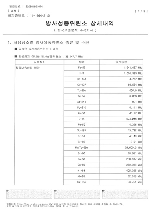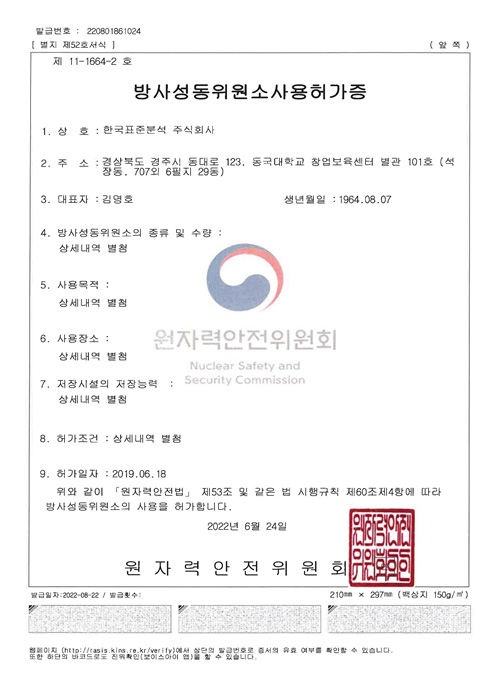 2019년 6월 국내 민간기업 최초로 원자력안전위원회로부터 원전발생 중저준위 방사성폐기물 방사능 분석 목적의 방사성 동위원사용허가를 획득하였습니다.
