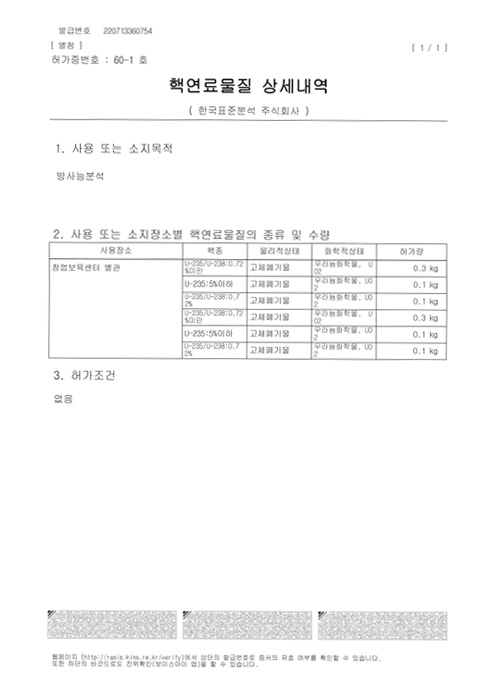 2021년 5월 원자력안전위원회로부터 방사능분석목적의 핵연료물질사용등허가를 획득하였습니다.