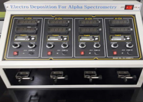 알파 핵종(U, Pu, Am)을 방사화학적 전처리(이온교환수지 등)로 추출, 분리 후 분리된 핵종 용액을 전해질용액을 넣고 pH를 조절 후 전류를 인가하면 분리된 핵종이 스테인레스 디스크에 부착되는 전기영동(Electro deposition) 현상을 활용한 알파분광분석 계측시료 제조 장치입니다.