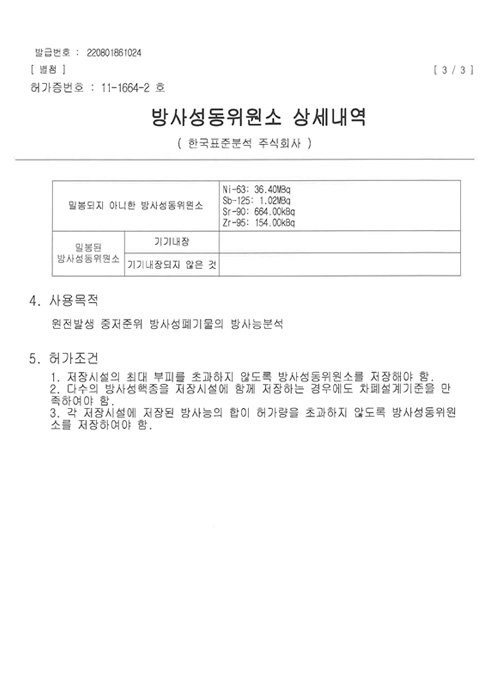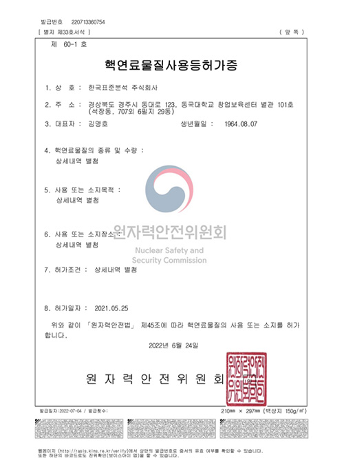 2021년 5월 원자력안전위원회로부터 방사능분석목적의 핵연료물질사용등허가를 획득하였습니다.