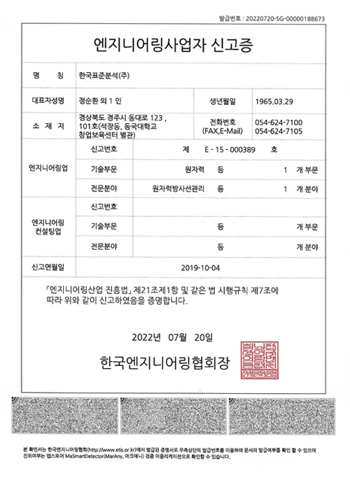 2022년 1월 KOLAS 한국인정기구로부터 기술적 능력과 품질경영시스템의 적절함을 인정받아 공인시험기관으로 인정을 획득하였습니다. 인정분야는 화학시험 (방사선, 방사능, 중성자) 분야의 9개 항목입니다.