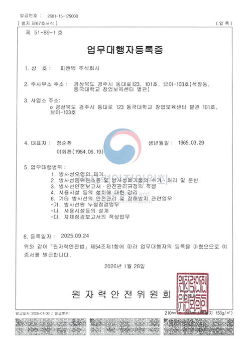 25년 9월 원자력안전위원회로부터 방사성물질 취급 및 방사선 안전관리 업무 등에 대한 업무대행자 등록을 완료하였습니다.
